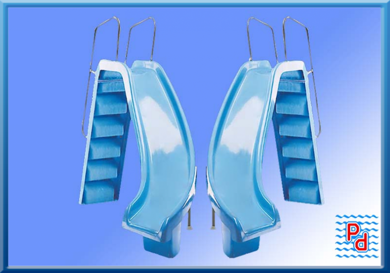 • Scivoli realizzati in poliestere e fibra di vetro, scale di accesso con gradini antiscivolo e corrimano. Attacco di alimentazione acqua continua sullo scivolo. Disponibili con curva a dx o sx